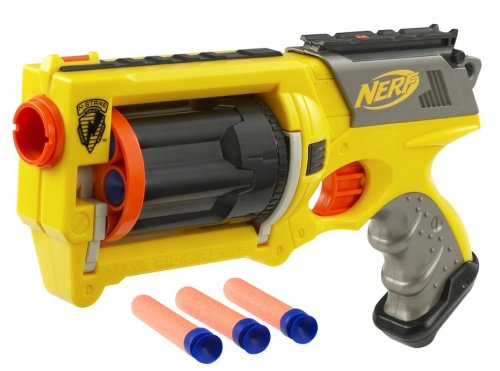 Got this NERF gun for a great price, about the same as they offer it for on their website direct. Very cool because you can load 6 darts at once, making for a faster shot. I didn't know the darts that come with it were going to be suction cup darts, so that was a nice surprise. We can shoot at the front door or a patio door and the darts stick which is fun. And they really do stick, not like things that are supposed to suction cup onto something but fall right off. For a little while, NERF is having a promotion where if you send in a receipt and a UPC code, they will send you free darts, they don't even require you to pay S&H. Check out their site to see if they are still offering it. Getting the darts for free pays for this gun and then some! We like this NERF gun better than the others my son has. This is the easiest one, and quickest, too.